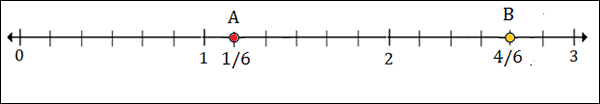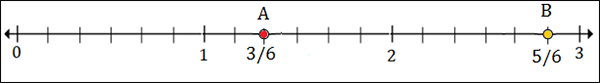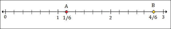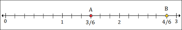 To plot 1$\frac{1}{2}$ or 1$\frac{3}{6}$, we put a point between 1 and 2; 3 marks to the right of 1.