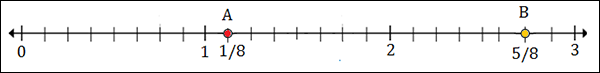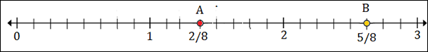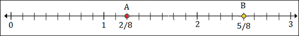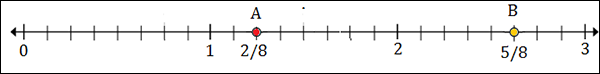 To plot 2$\frac{5}{8}$, we put a point between 2 and 3; 5 marks to the right of 2.