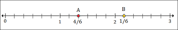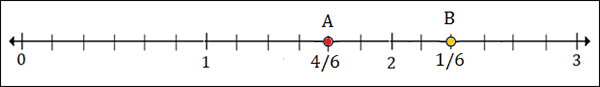 To plot 2$\frac{4}{6}$, we put a point between 2 and 3, 4 marks to the right of 2.