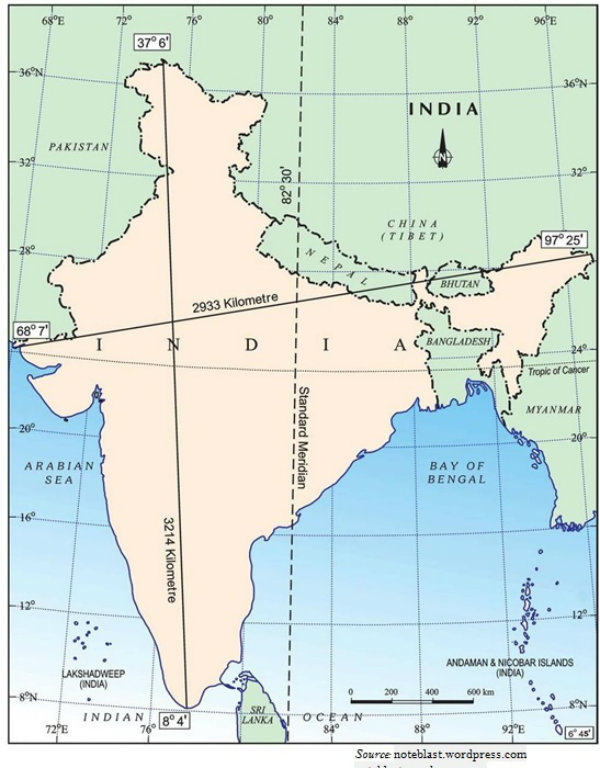 The mainland of India extends between latitudes 8°'N and 37°6'N and longitudes 68°7'E and 97°25'E (as shown in the map given below). The southern boundary extends up to 6°45'N latitude in the Bay of Bengal.