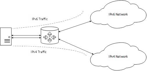 In the above diagram, a server having IPv4 as well as IPv6 address configured for it can now speak with all the hosts on both the IPv4 as well as the IPv6 networks with the help of a Dual Stack Router. The Dual Stack Router, can communicate with both the networks. It provides a medium for the hosts to access a server without changing their respective IP versions.