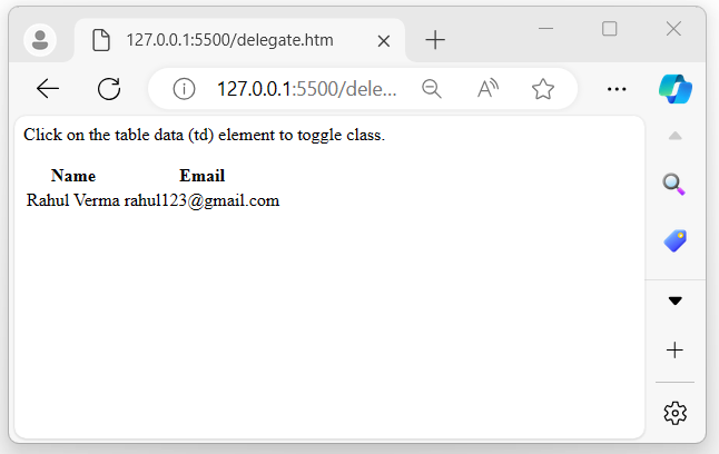 After executing the above program, it displays a table with some table data, when the user clicks on the table data element, it toggles between the class "demo" −