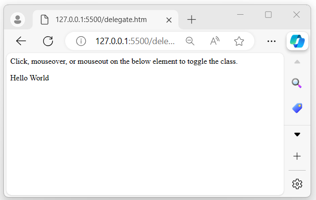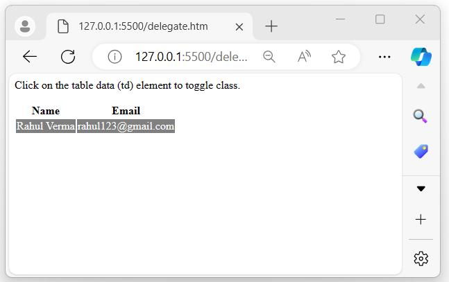 The following is another example of the jQuery event delegate() method. Here, we use this method with the table element to toggle the class for the td element inside the table when the user clicks −