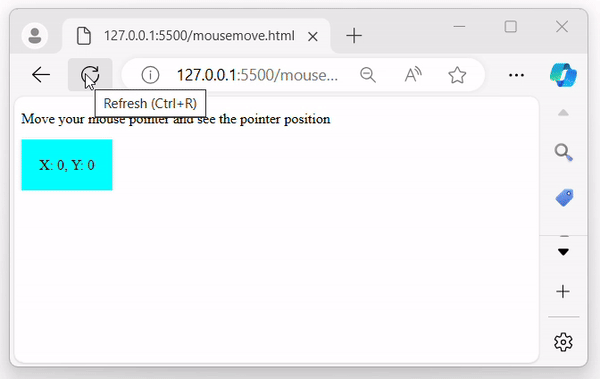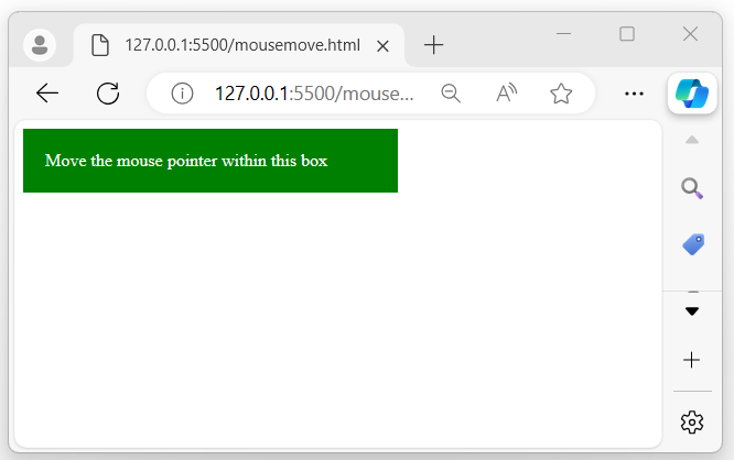 After executing the above program, it displays a box. When the mouse pointer moves over the browser screen, the position of the pointer will be displayed within the box itself −