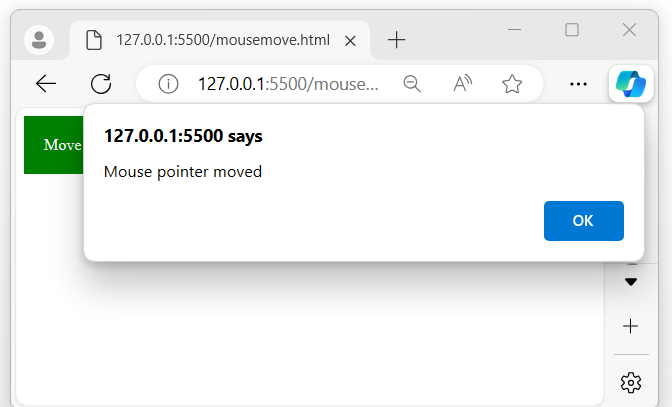 The above program displayed a box, when the mouse pointer moved within the box a pop-up alert message will appear on the browser screen −
