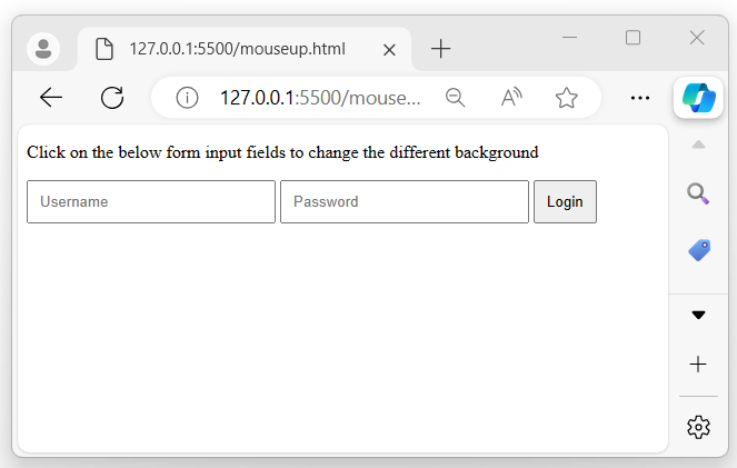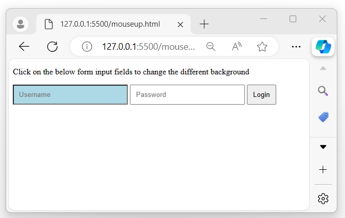 Once the above program is executed, a form with two input fields and a button is displayed. When the user clicks and releases the mouse button over an input field, the background color changes to 'light blue' −