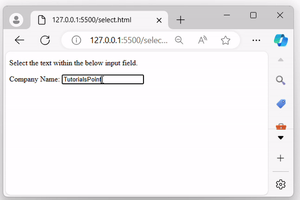 The program above program displays an input field with a predefined value. When the user selects text within this input field, a pop-up alert message will appear on the browser screen −
