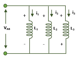 Here, the three inductor with inductance L1, L2 and L3 are connected in parallel. The voltage across the terminal is VAB, by applying kirchoff's current law, the total current is the sum of individual current inductor i.e., −