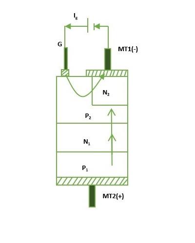 when gate terminal is negative with respect to MT1, gate current flows through P2N3 junction, and reverse biased junction N1P2 is forward biased as in a normal thyristor. As a result, triac starts conducting through P1N1P2N3 layers initially.