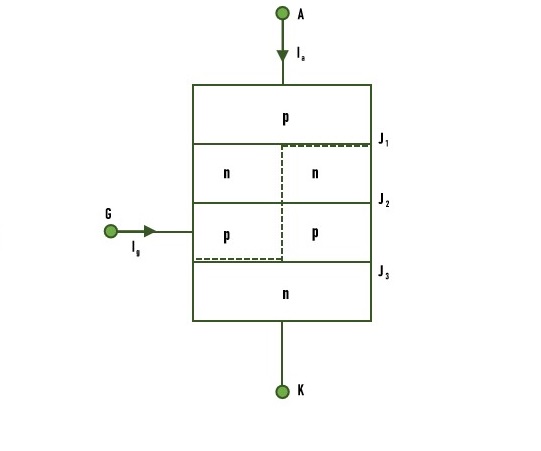 The principle of thyristor operation can be explained with the use of its two-transistor model(or two-transistor analogy). It is obtained by bisecting the two middle layers, along the dotted line, in two separate halves as shown in the following figure −