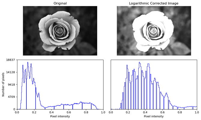 The following example demonstrates how logarithmic correction affects the appearance and pixel intensity distribution of an image. The original and logarithmic corrected images, along with their histograms, are displayed side by side for visual comparison.